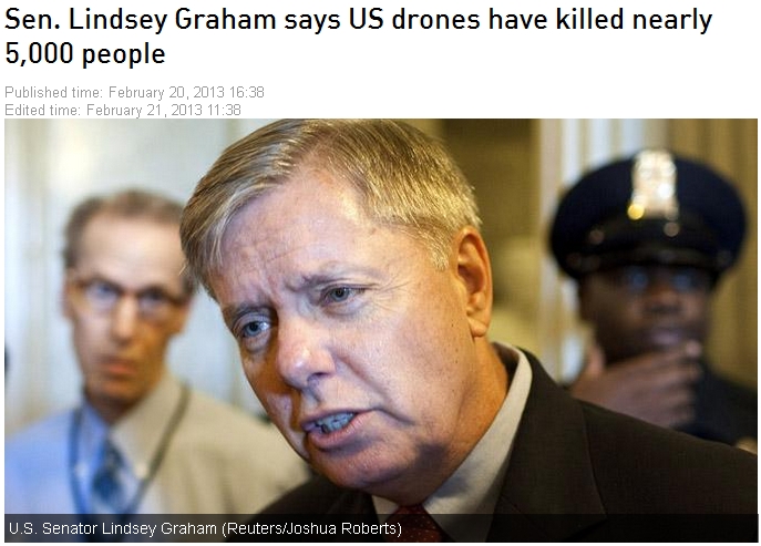 RT 2013-02-20"Vi har mördat minst 4.700 människor" - Senator Lindsey Graham USA. "Ibland dödar vi oskyldiga och det är ju tråkigt men vi har faktiskt mördat en del höga al-Qaidamedlemmar också."